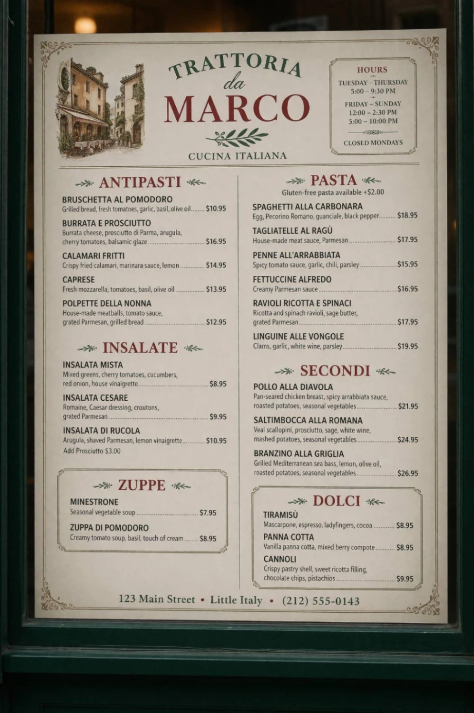 - Optimized: "Photorealistic Italian restaurant menu lying flat on a rustic wooden table, elegant typography, detailed dishes with prices in euros, natural window lighting."