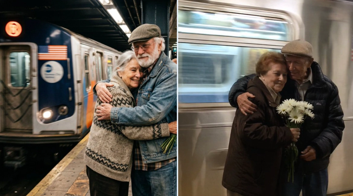 - Original Prompt (@WolfRiccardo): "Create a completely RAW quality, unprocessed, unedited image with full iPhone camera quality. A subway station in USA, a momentary blur. The subway is in motion. In front of the subway, there is an elderly woman and man holding daisies. They are hugging."